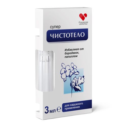 - Супер Чистотел. В основе – гидрокарбонат натрия, гидроокись натрия. Гель разрушает верхний слой папилломы. Препарат также стимулирует деление здоровых клеток, благодаря чему после удаления новообразования не остаётся шрама.