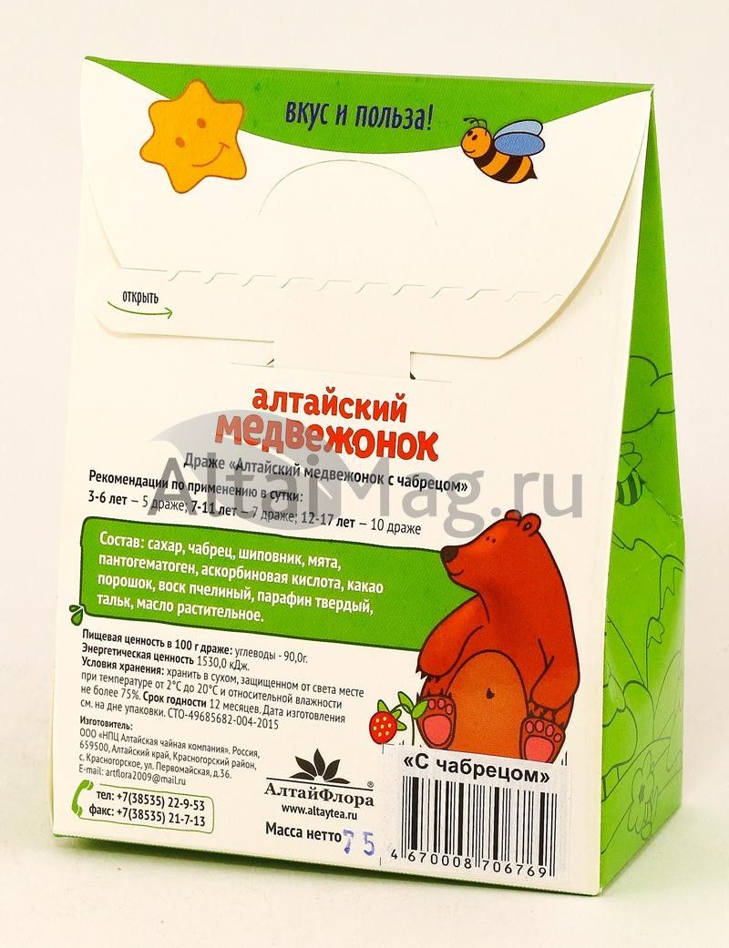 - Купите Алтайский медвежонок драже с чабрецом 75 г в Ельце по доступной цене 152 ₽ с доставкой на дом или заберите Ваш заказ в Ельце из ближайшего пункта выдачи, сделав заказ на AltaiMag.ru.