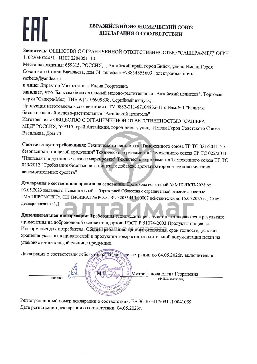 Все компоненты бальзама «Алтайский Целитель» содержатся в виде медовых вытяжек, что позволяет эффективно и быстро корректировать неблагоприятные изменения организма любого происхождения, как при приеме во внутрь, так и при применении наружно, т.к медовые вытяжки обладают полным усвоением и максимальным положительным действием.