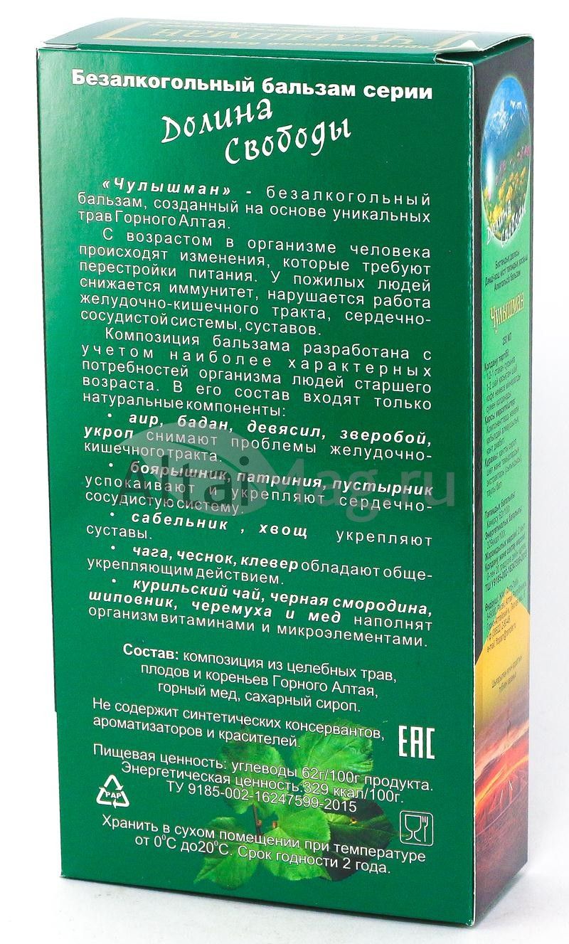 - Купите Бальзам Чулышман (для старшего возраста), 250 мл в Ельце по доступной цене 233 ₽ с доставкой на дом или заберите Ваш заказ в Ельце из ближайшего пункта выдачи, сделав заказ на AltaiMag.ru.