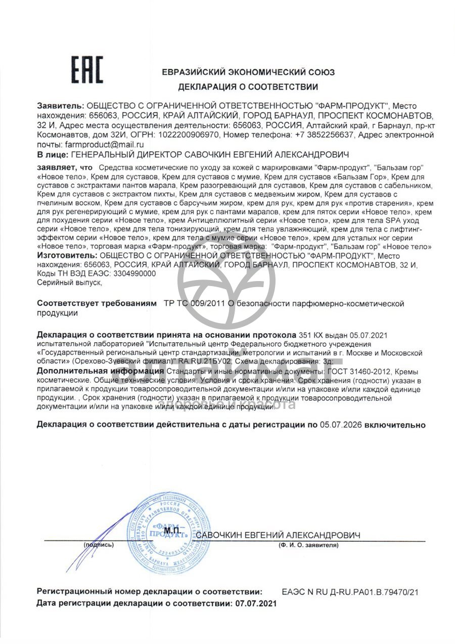 Вода очищенная, масло подсолнечника, глицерил стеарат, цетеарет-20, цетеарет-12, цетеариловый спирт, цетилпальмитат, глицерин, экстракт перца жгучего, ментол, камфора, гидрированное касторовое масло ПЭГ-40, гексилстеарат, С12-С15 алкилбензоат, масло минеральное, экстракт живицы лиственницы в кедровом масле, экстракт розмарина, экстракт прополиса, мумиё, эфирное масло пихты сибирской, метилникотинат, эфирное масло эвкалипта, эфирное масло розмарина, карбомер, ксантановая смола, триэтаноламин, этилгексилглицерин, феноксиэтанол, ВНТ.Характеристики: