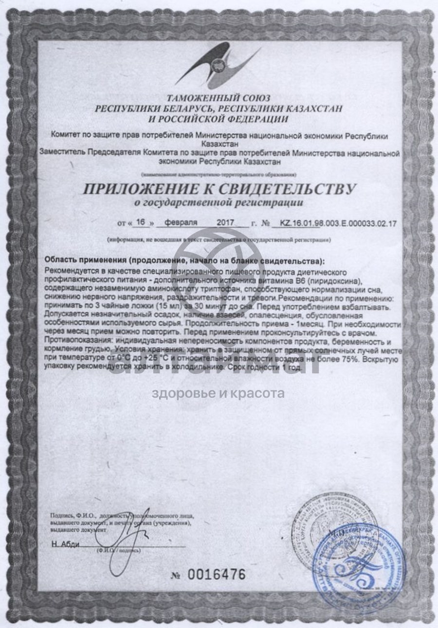 Рекомендация по применению: принимать по 1 чайной ложке за 30 минут до сна. При наличии осадка взболтать перед употреблением.