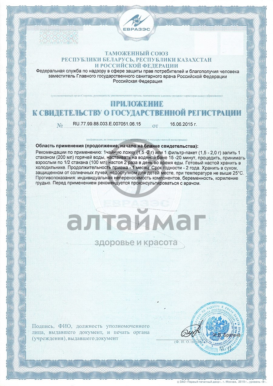 1 фильтр-пакет (1,5-2,0 г) залить 1 стаканом (200 мл) горячей воды, настоять на водяной бане 15-20 минут, процедить, принимать взрослым по ½ стакана 2 раза в день во время еды. Готовый настой хранить в холодильнике. Продолжительность приема – 1 месяц.Противопоказания: