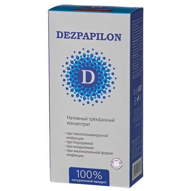 «Dezpapilon» – натуральная трёхфазная амфифильная формула на основе мицелл нативных масел растений, биогенных концентратов природных компонентов и диатомовых водорослей, направленная на штаммы папилломавируса человека, симптомы распространения инфекции (бородавки, папилломы, кондиломы), сопутствующие нарушения эпителиального слоя, генитальных органов, дефекты клеток тканей и органов.