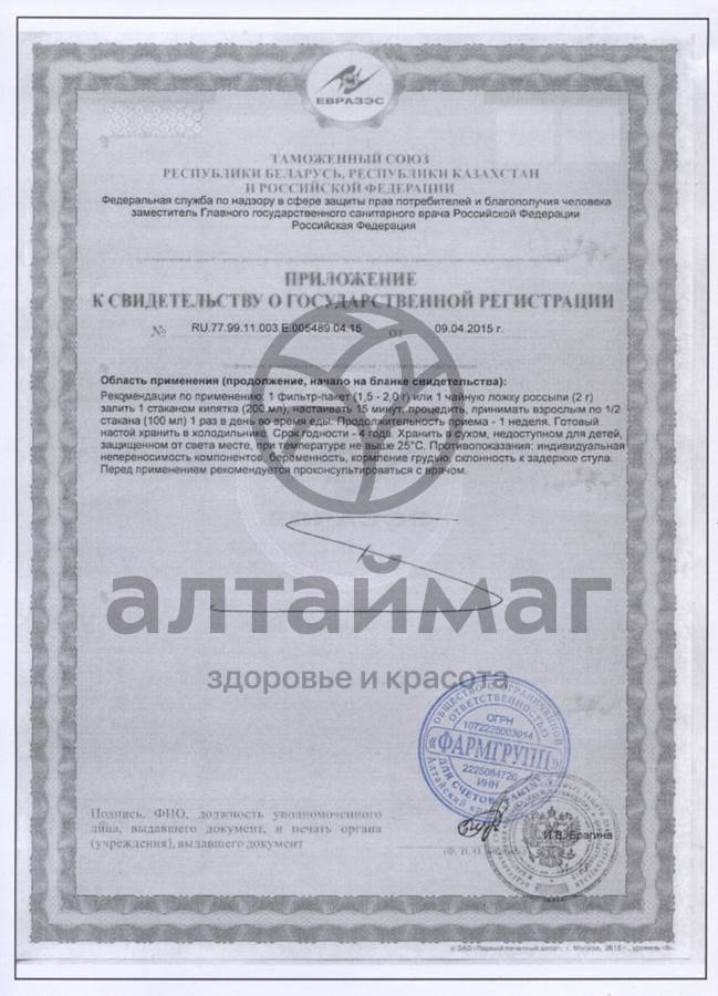 1 фильтр-пакет (1,5-2 г) или 1 чайную ложку (2 г), залить 1 стаканом кипятка (200 мл), настоять 15 минут, процедить, принимать взрослым по ½ стакана (100 мл) 1 раз в день во время еды. Готовый настой хранить в холодильнике.
