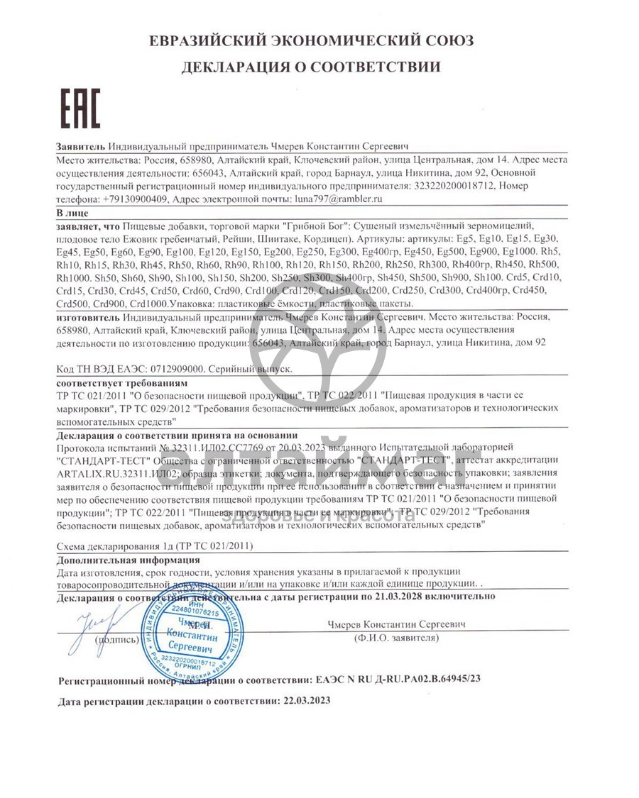 - Также содержит витамины B1, В2, В6, коэнзим Q10 (около 5 мг/100гр мицелия)