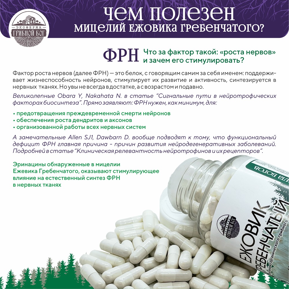 Эринацины обнаруженные в мицелии Ежевика Гребенчатого, оказывают стимулирующее влияние на естественный синтез ФРН в нервных тканях