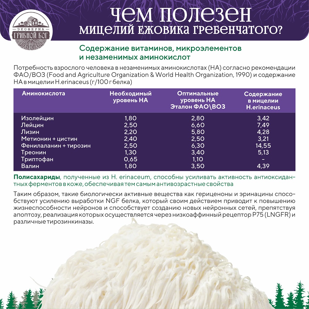 - В мицелии Ежовика Гребенчатого помимо Эринацина, который обеспечивает восстановление нейронных цепочек и оказывает широчайшее воздействие на прогрессивные процессы головного мозга, также содержится очень широкий ряд витаминов, микроэлементов и незаменимых вот лишь некоторые из них, содержащиеся в большем количестве, чем остальные