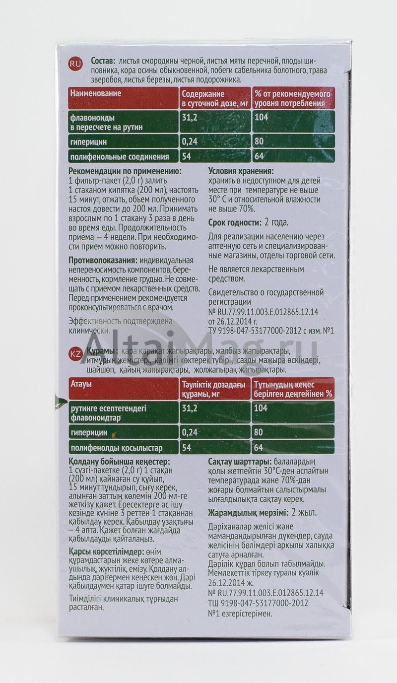 листья смородины черной, листья мяты перечной, плоды шиповника, кора осины обыкновенной, побеги сабельника болотного, трава зверобоя, листья березы, листья подорожника