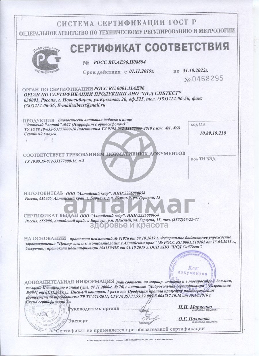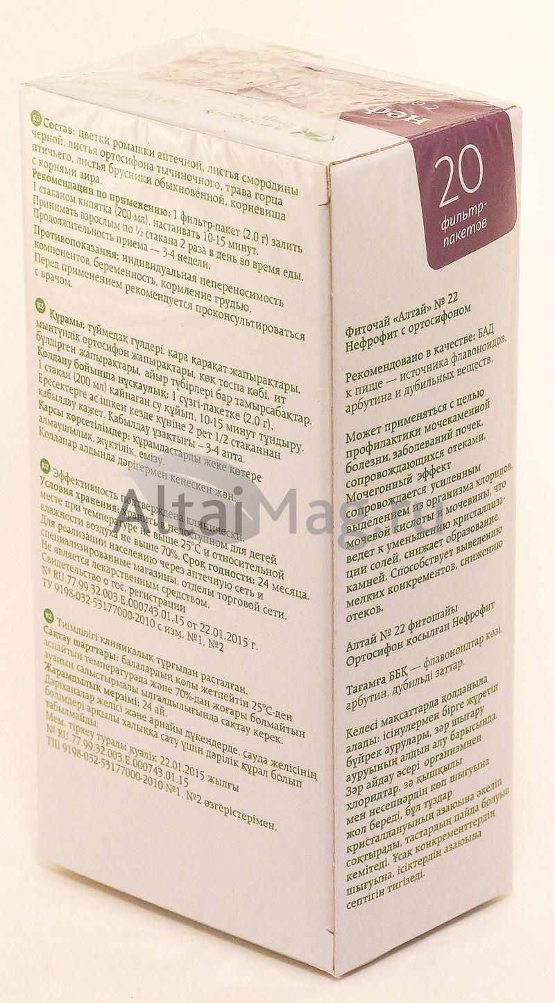 - Чтобы купить Фиточай Алтай №22 нефрофит, 20 пакетиков совершите всего несколько шагов: укажите количество продукта и нажмите на кнопку «Купить».