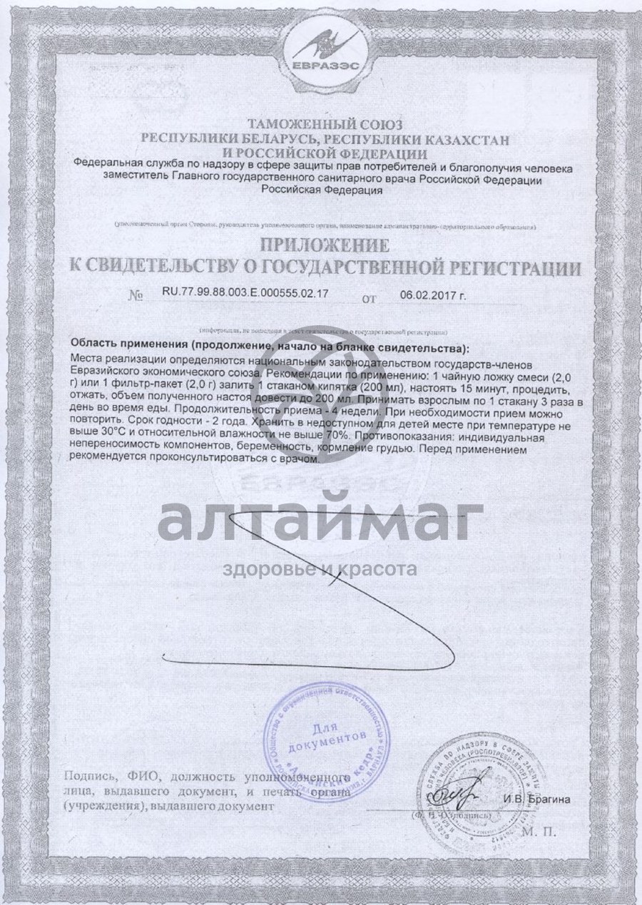 1 фильтр-пакет залить 1 стаканом кипятка, настоять 15 минут, отжать, объем полученного настоя довести до 200 мл, принимать взрослым по 1 стакану 3 раза в день во время еды. Продолжительность приема - 4 недели. При необходимости прием можно повторить.