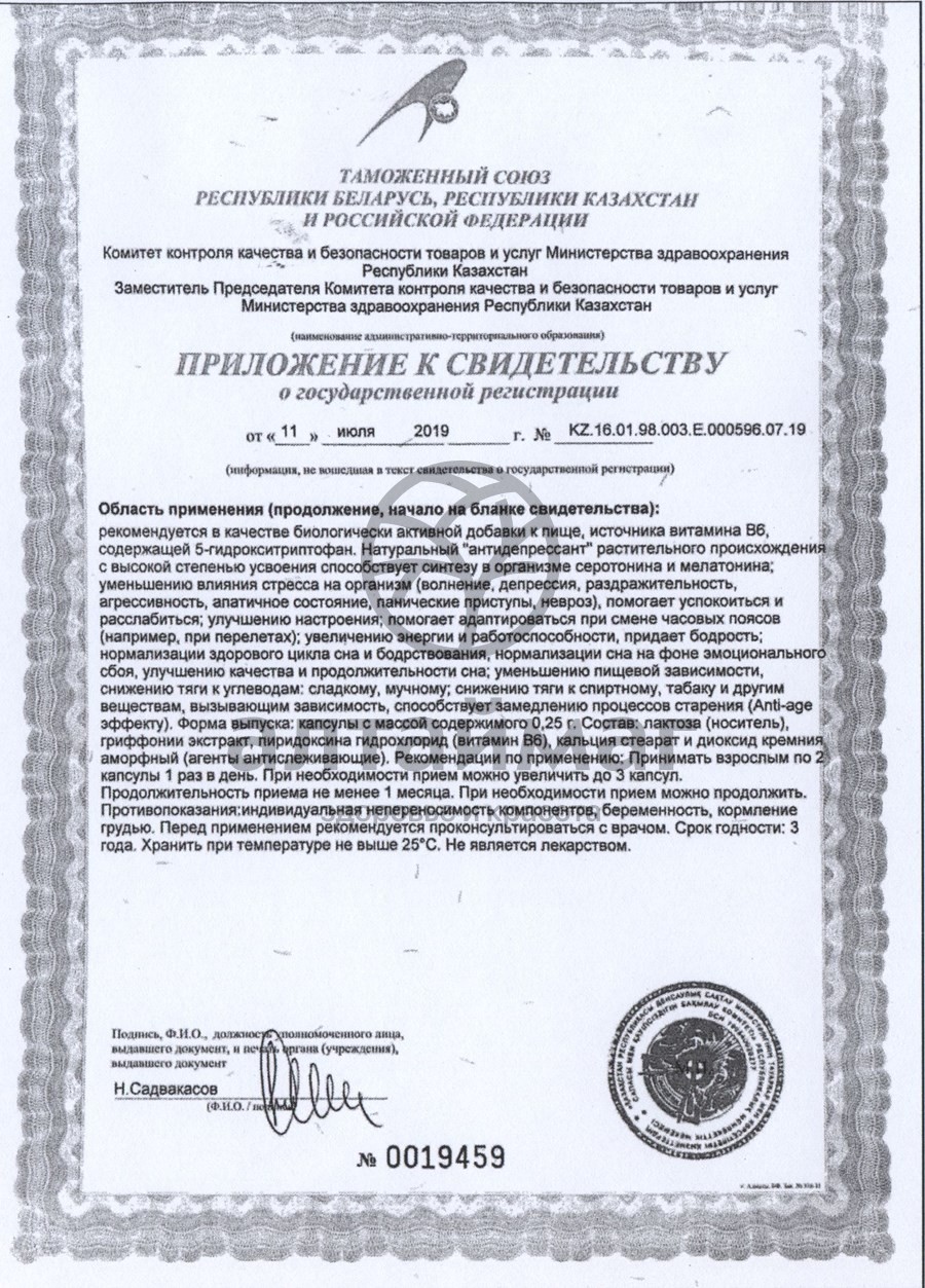Рекомендуется в качестве биологически активной добавки к пище - источника Витамина В6, содержащей 5-гидрокситриптофан.