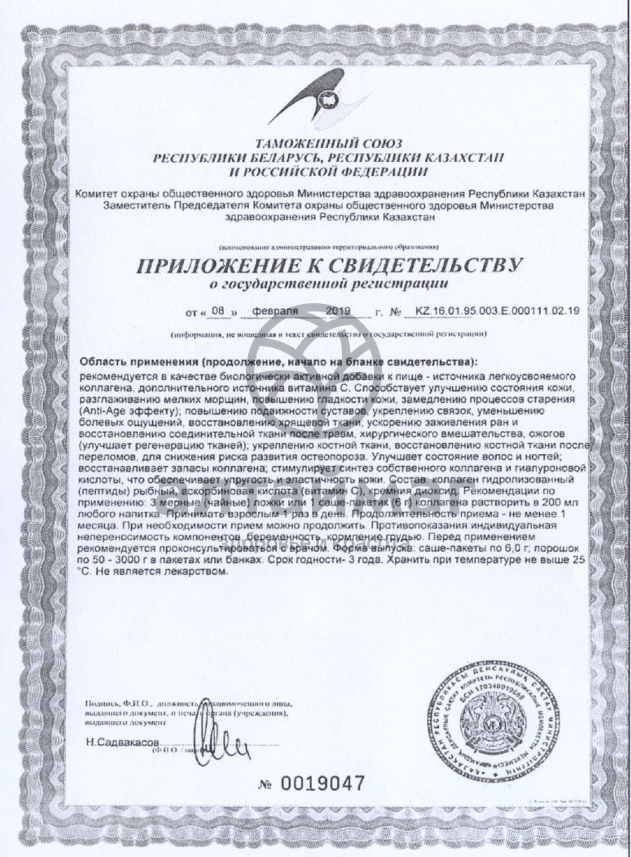 • Максимальная биодоступность. Гидролизованный рыбный коллаген в отличие от других форм коллагена усваивается организмом максимально эффективно. Уже через 6 часов после приема до 95% гидролизованного коллагена обнаруживается в крови и в тканях по всему телу.