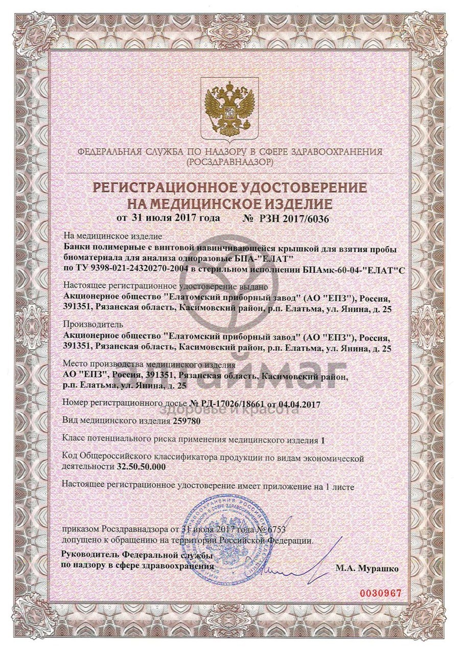 Контейнер находится в индивидуальной упаковке в виде конверта из прозрачной полипропиленовой пленки, на поверхности которого зелёным цветом нанесена соответствующая требованиям нормативной документации информация: название изделия, название и контакты производителя, логотип, Регистрационное удостоверение, обозначение технических условий, руководство по эксплуатации, гарантийный срок, рекомендации по однократности применения, рекомендации по утилизации, штрих-код.