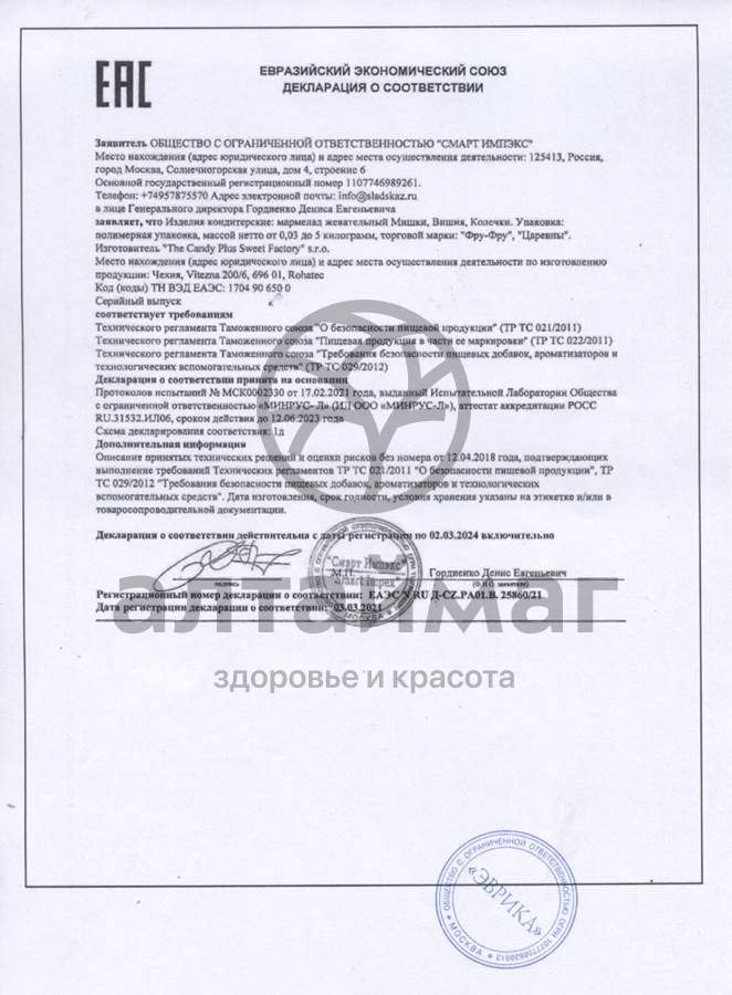 Мармелад особенно понравится поклонницам мультсериала и девочкам-модницам, ведь он выполнен в виде колечек с камушками. Продукт обладает ярким ароматом и насыщенными фруктовыми вкусами, среди которых яблоко, малина, апельсин и лимон.