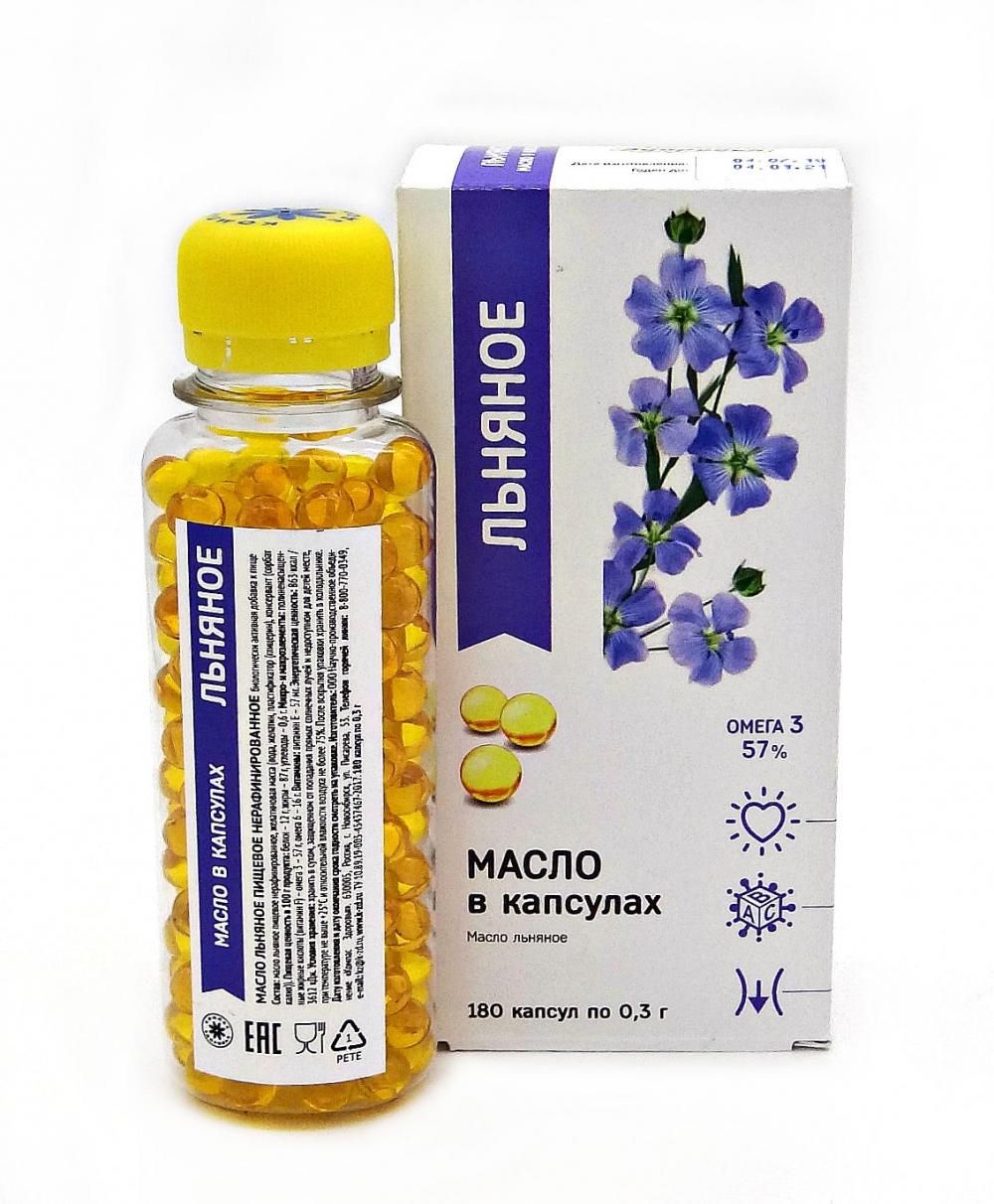 Льняное масло получено методом холодного отжима из семян масличного льна. Полезные свойства льняного масла, богатого Омега-3 (до 60%), усилены наличием таких дефицитных микроэлементов как селен, хром, кремний. При регулярном использовании льняного масла повышается устойчивость организма к изменениям погоды, уменьшается метеозависимость, предотвращаются сердечно-сосудистые заболевания, сахарный диабет, аллергия, запоры и др. 180 желатиновых капсул по 0,3г.