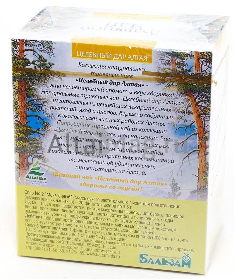 Натуральные травяные чаи Целебный дар Алтая изготовлены из ценнейших лекарственных растений, ягод и плодов, бережно собранных в экологически чистых районах Алтая. Попробуйте травяной чай, из коллекции Целебный дар Алтая, и он наполнит Вас силой могучих гор, бодростью горных рек, энергией и здоровьем сибирской тайги, создаст атмосферу приятных воспоминаний или мечтаний об удивительных путешествиях на Алтай. Сбор обладает противовоспалительным и мягким мочегонным действием, способствует устранению отоков, препятствует образованию камней. Оказывает дезинфицирующее, антисептическое, вяжущее, мочегонное действие. Эффективен при циститах, уретрите, заболеваниях мочевыводительной системы.