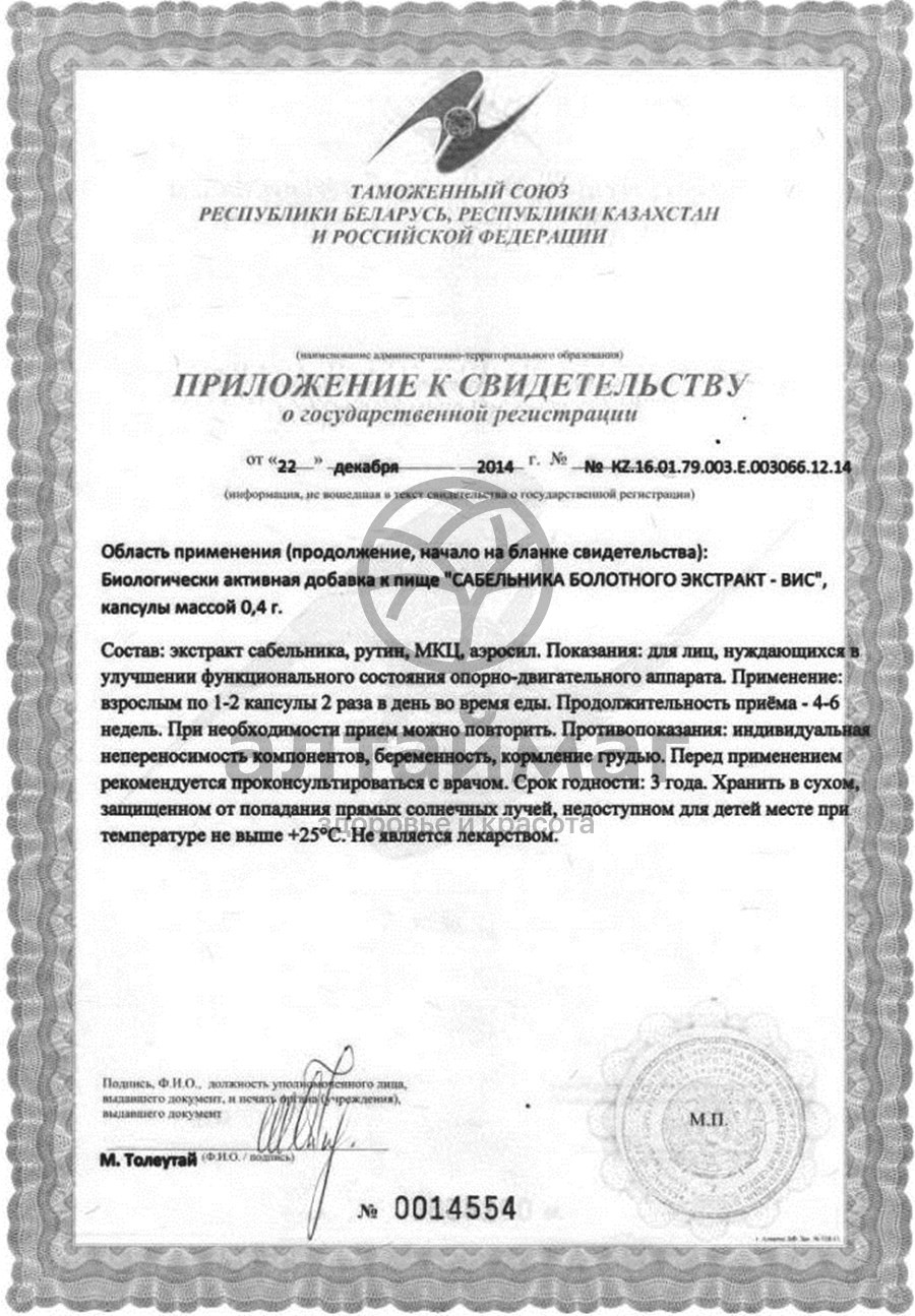 «Сабельника болотного экстракт-ВИС» - для лиц, нуждающихся в улучшении функционального состояния опорно-двигательного аппарата - в качестве биологически активной добавки к пище - источника флавоноидов.