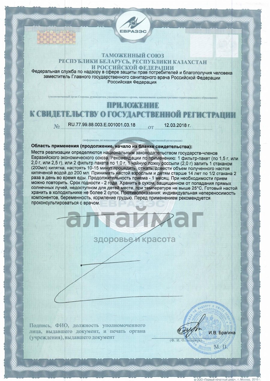 1 чайную ложку россыпи (2,0 г) залить 1 стаканом (200 мл) кипятка, настоять в течение 10-15 минут, процедить, довести объем полученного настоя кипяченой водой до 200 мл. Принимать настой взрослым и детям старше 14 лет по ½ стакана 2 раза в день во время еды. Продолжительность приема - 1 месяц. При необходимости прием можно повторить.Фармакологическое действие: