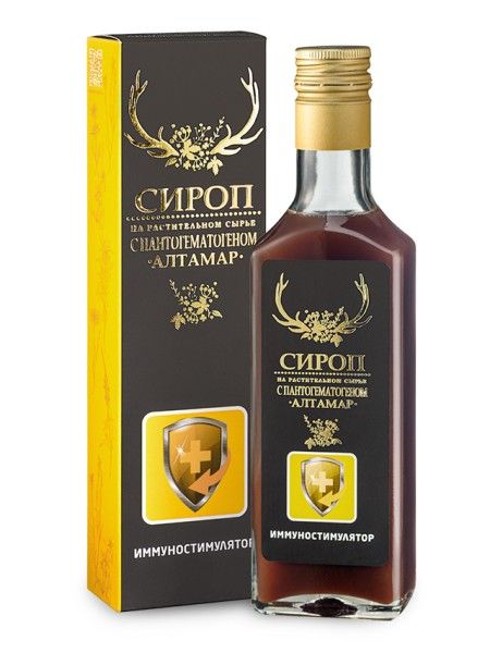 Сироп на растительном сырье с пантогематогеном «Алтамар» "Иммуностимулятор" направленного действия активизирует защитные силы организма, повышая иммунитет. Особенность линейки сиропов "Алтамар" содержание в составе пантогематогена - сильнейшего природного адаптогена и тоника.